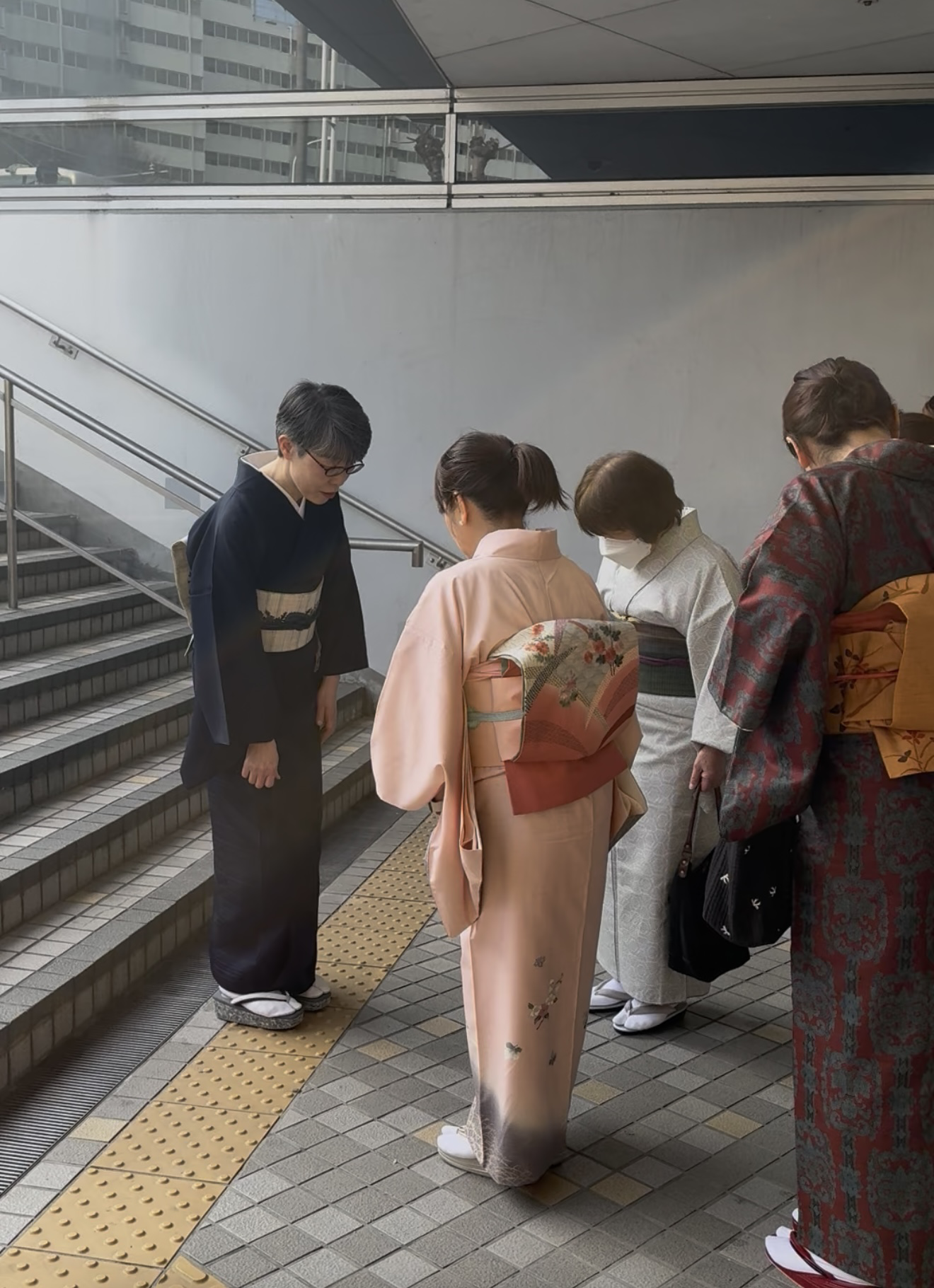 階段の上り下りを先生に教えてもらいました。草履で歩く事も初めての生徒さん達。