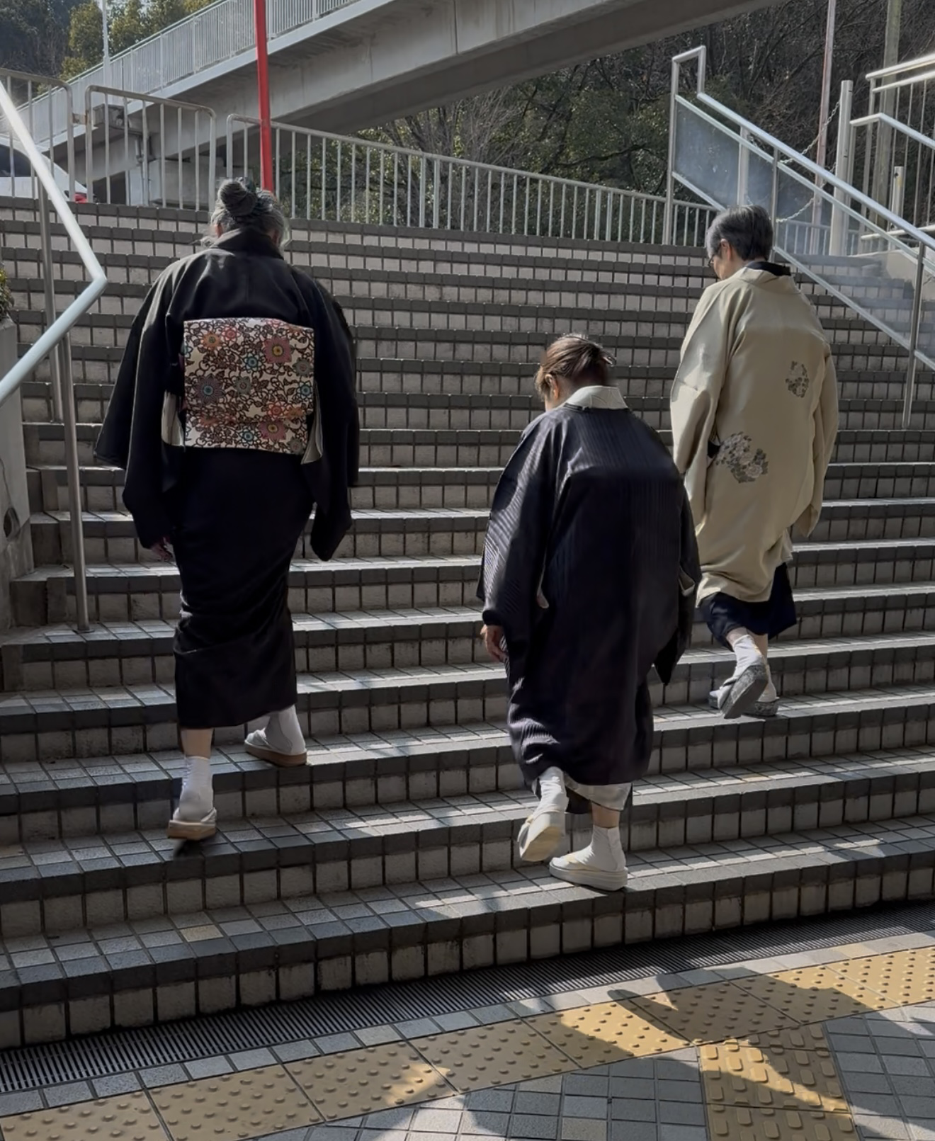 階段の上り下りを先生に教えてもらいました。草履で歩く事も初めての生徒さん達。