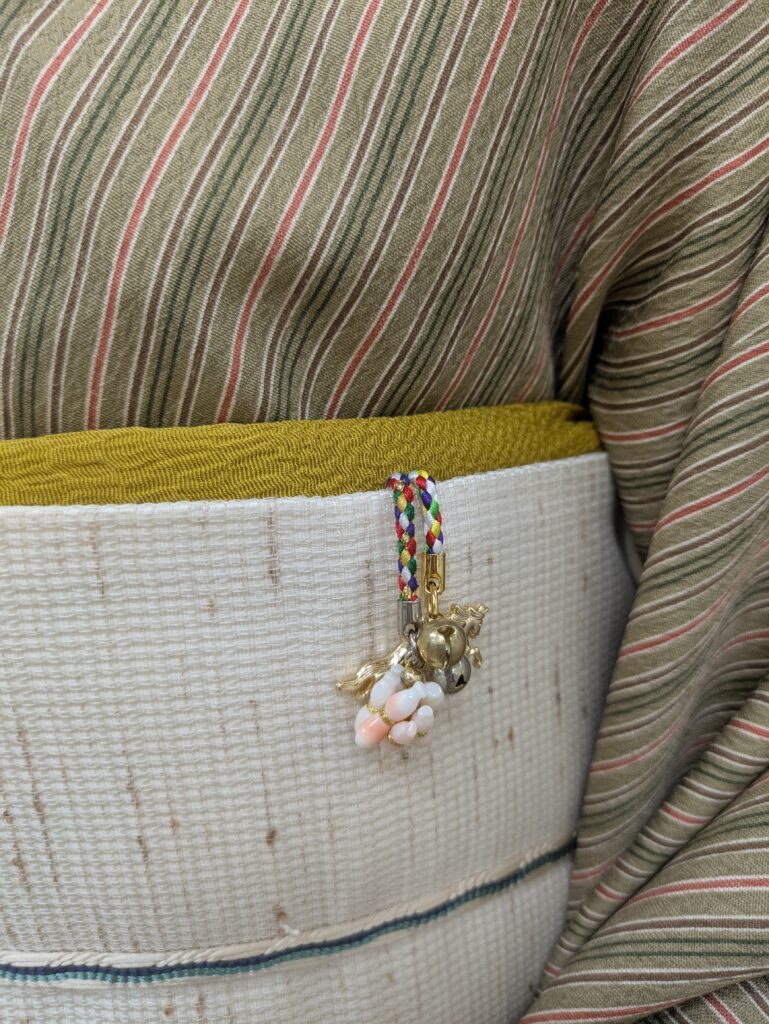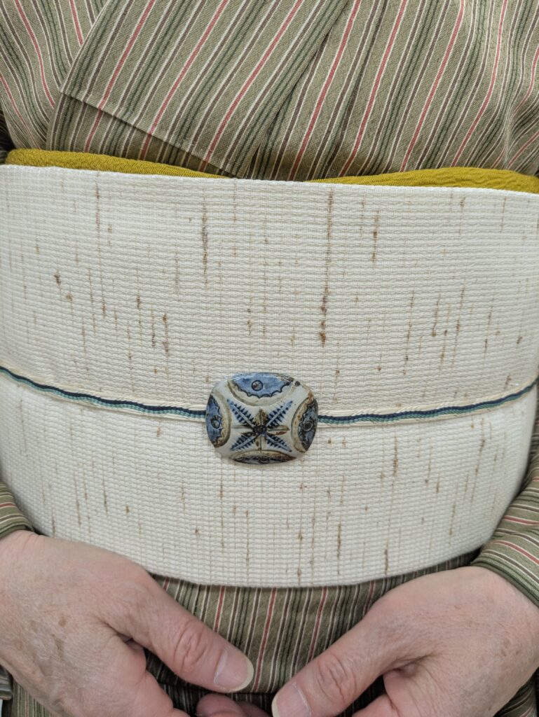 焼き物の帯留め。ぜんまい紬の自然でざっくりとした雰囲気に合っていますね。