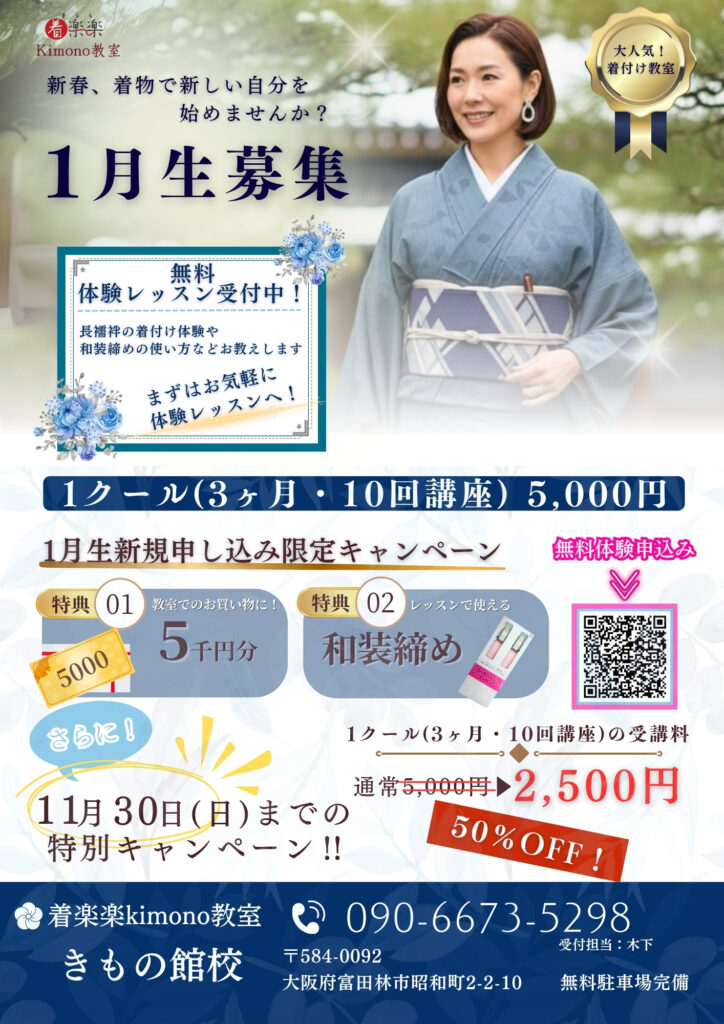 きもの館では、2026年1月スタートの着付け教室 1月生を募集しています。そして今回は、特に見逃せない【11月30日(日)までの限定キャンペーン】を実施中です!
